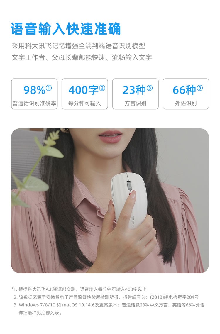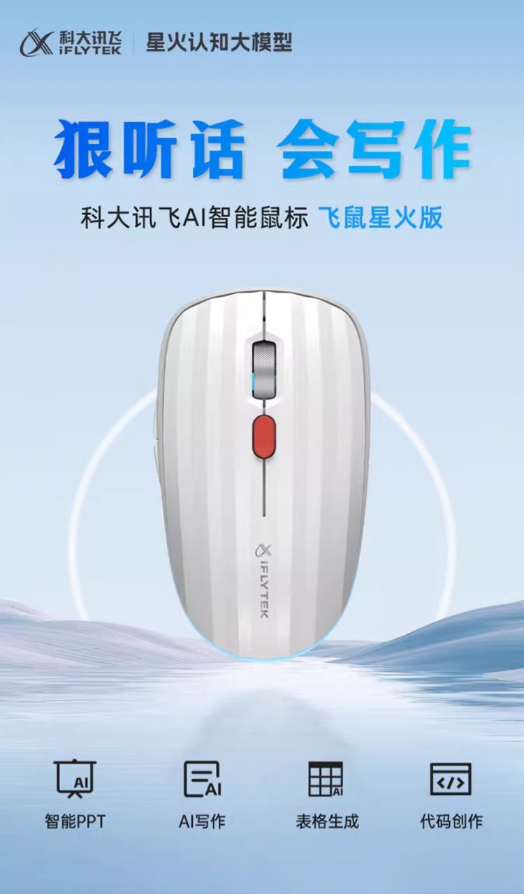 科大讯飞 AI智能语音无线鼠标 飞鼠星火版 办公可充电 语音转文字 语音识别 智能PPT 白色